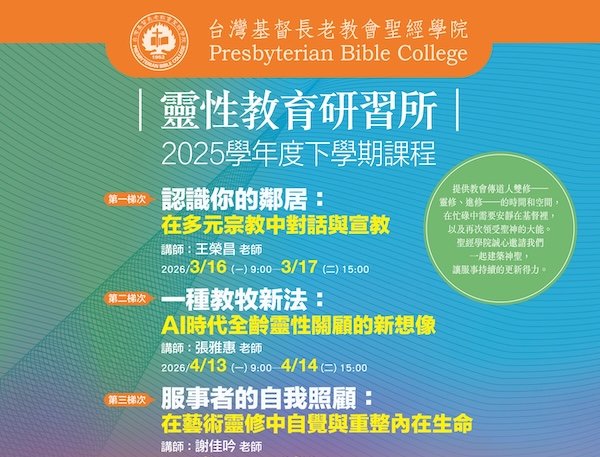 靈性教育研習所旨在提供以神學和聖經為基礎的課程,為牧者(牧師、傳道人)提供靜修與進修的「雙修」機會。無可諱言,牧者日復一日、月復一月委身於充滿挑戰與磨練的服事,可能很容易就感覺身心疲累,甚至覺得靈命枯竭。為此,我們提供多元課程,包括聖經詮釋、講道、牧養關顧、宣道、乃至牧者本身的自我認識與靈命成長,期能透過講師精闢的授課與學員之間坦誠的互動分享,幫助牧者抱持蒙召之初的火熱心志,以信、望、愛持續忠心在上帝所託付的使命,並在服事中因深深體驗上帝的同在與大能而滿有活力與創意。